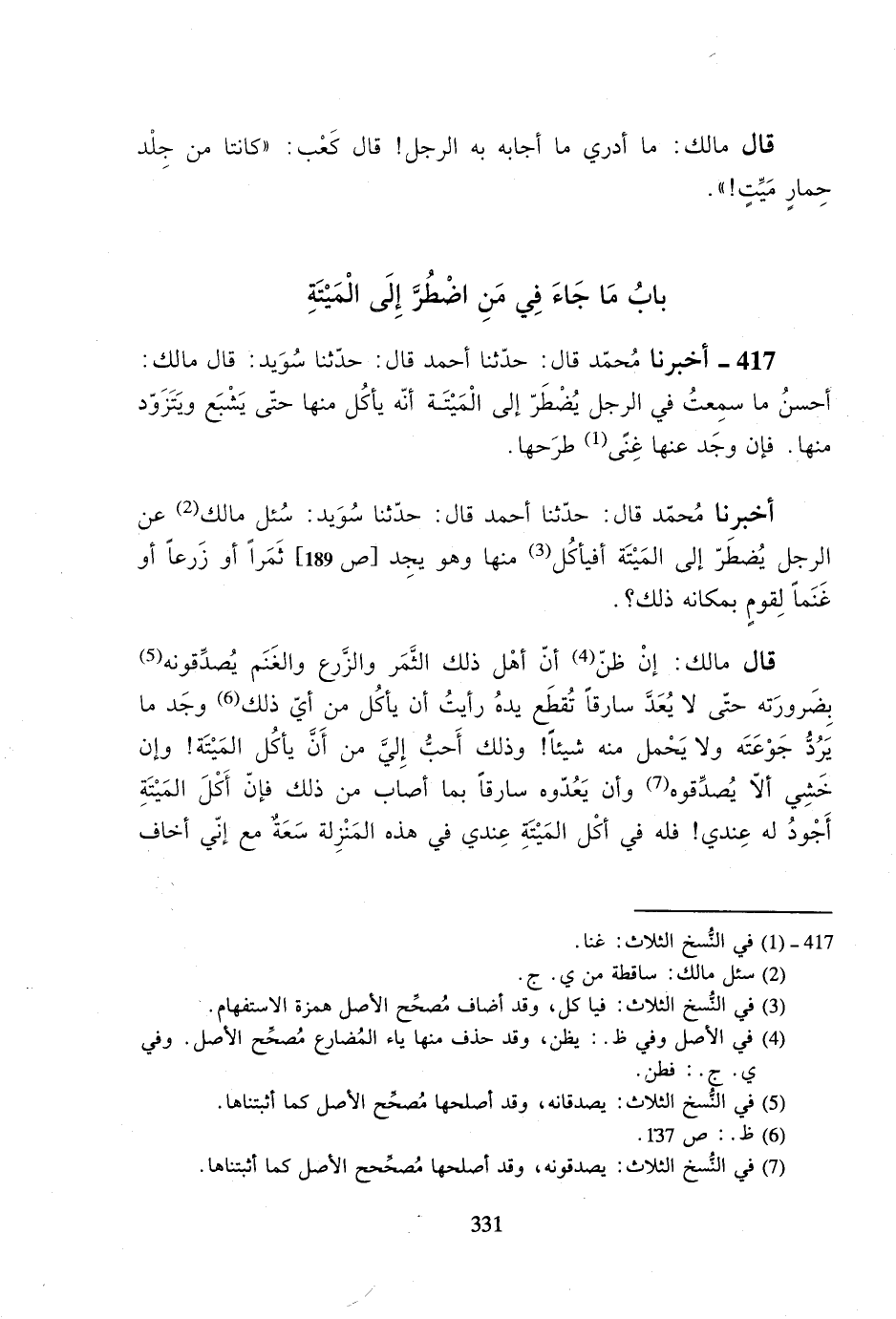 417- أخبرنا محمد قال: حدثنا أحمد قال: حدثنا سويد: قال مالك: أحسن ما سمعت في الرجل يضطر إلى الميتة أنه يأكل منها حتى يشبع ويتزود منها. فإن وجد عنها غنىً طرحها.