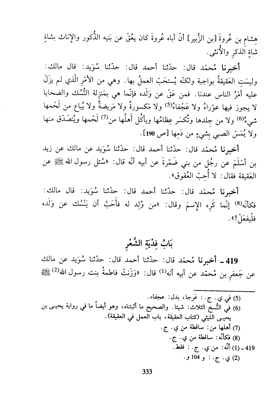 419- أخبرنا محمد قال: حدثنا أحمد قال: حدثنا سويد عن مالك عن جعفر بن محمد عن أبيه أنه قال: ((وزنت فاطمة بنت رسول الله صلى الله عليه وسلم #334# شعر الحسن والحسين وزينب وأم كلثوم -رضوان الله عليهم!- فتصدقت بزنته فضةً)).