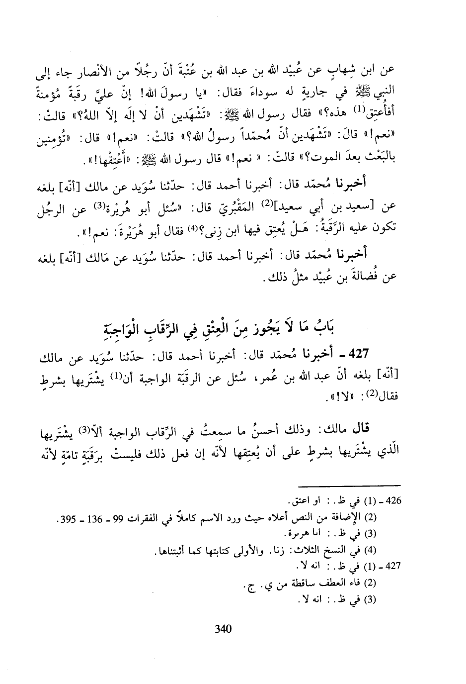 427- أخبرنا محمد قال: أخبرنا أحمد قال: حدثنا سويد عن مالك [أنه] بلغه أن عبد الله بن عمر، سئل عن الرقبة الواجبة أن يشتريها بشرطٍ فقال: ((لا!)).