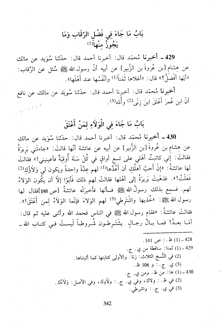 430- أخبرنا محمد قال: أخبرنا أحمد قال: حدثنا سويد عن مالك عن هشام بن عروة [بن الزبير] عن أبيه عن عائشة أنها قالت: ((جاءتني بريرة فقالت: إني كاتبت أهلي على تسع أواقٍ في كل سنة أوقيةٌ فأعينيني!)) فقالت لها عائشة: ((إن أحب أهلك أن أعدها لهم عدةً واحدةً ويكون لي ولاؤك فعلت!)). فذهبت بريرة إلى أهلها فقالت لهم ذلك فأبوا إلا أن يكون الولاء لهم. فسمع بذلك رسول الله صلى الله عليه وسلم فسألها فأخبرته عائشة فقال لها رسول الله صلى الله عليه وسلم: ((خذيها واشترطي لهم الولاء فإنما الولاء لمن أعتق!)). فقالت عائشة: ((فقام رسول الله صلى الله عليه وسلم في الناس فحمد الله وأثنى عليه ثم قال: أما بعد! فما بال رجالٍ يشترطون شروطاً ليست في كتاب الله -#343# عز وجل!- فما كان ليس بكتاب الله فهو باطلٌ وإن كان مائة شرطٍ! فقال: وقضاء الله -عز وجل!- أحق وشرط الله أوثق! وإنما الولاء لمن أعتق)).