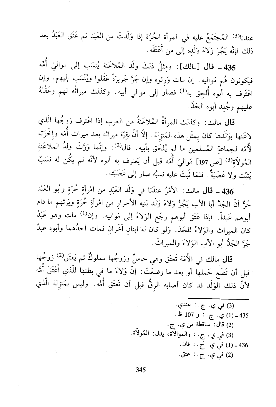 435- قال [مالك]: ومثل ذلك ولد الملاعنة ينسب إلى موالي أمه فيكونون هم مواليه. إن مات ورثوه وإن جر جريرةً عقلوا وينسب إليهم. وإن اعترف به أبوه ألحق به فصار إلى موالي أبيه. وكذلك ميراثه لهم وعقله عليهم وجلد أبوه الحد.