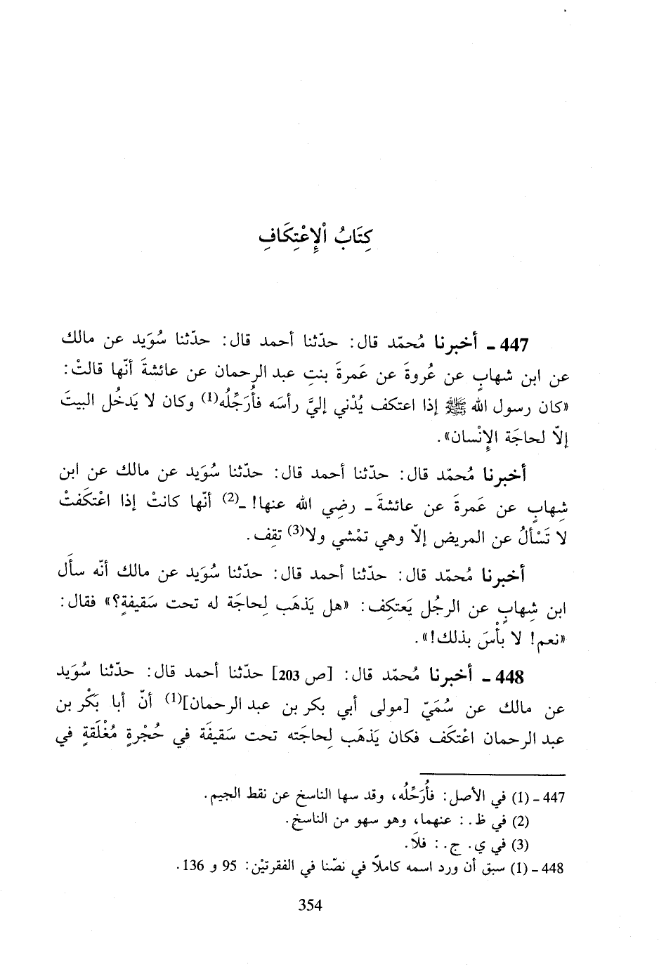 447- أخبرنا محمد قال: حدثنا أحمد قال: حدثنا سويد عن مالك عن ابن شهابٍ عن عروة عن عمرة بنت عبد الرحمان عن عائشة أنها قالت: ((كان رسول الله صلى الله عليه وسلم إذا اعتكف يدني إلي رأسه فأرجله وكان لا يدخل البيت إلا لحاجة الإنسان)).