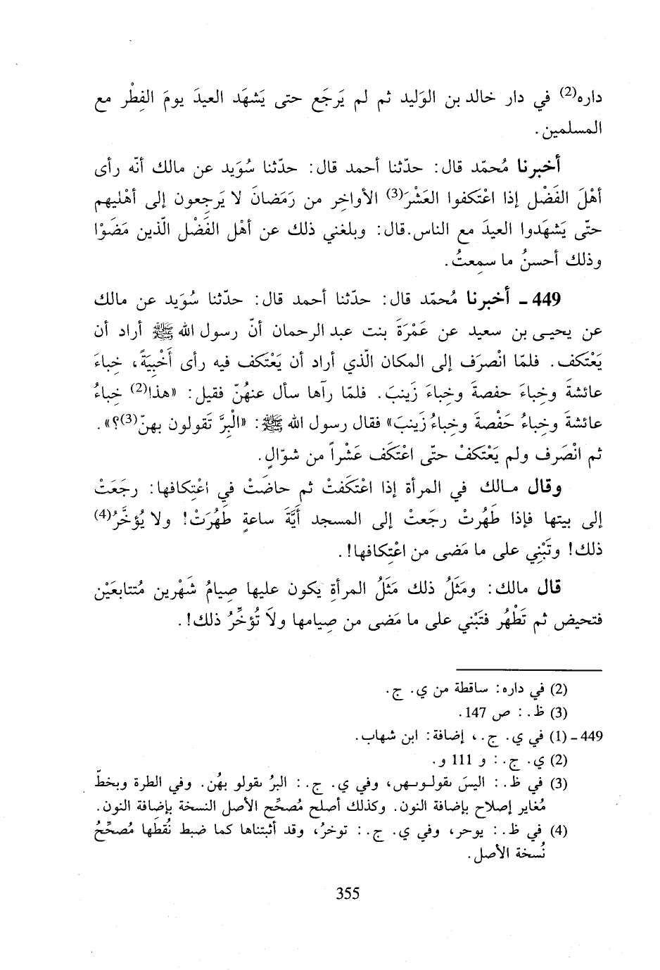 449- أخبرنا محمد قال: حدثنا أحمد قال: حدثنا سويد عن مالك عن يحيى بن سعيد عن عمرة بنت عبد الرحمان أن رسول الله صلى الله عليه وسلم أراد أن يعتكف. فلما انصرف إلى المكان الذي أراد أن يعتكف فيه رأى أخبيةً، خباء عائشة وخباء حفصة وخباء زينب. فلما رآها سأل عنهن فقيل: ((هذا خباء عائشة وخباء حفصة وخباء زينب)) فقال رسول الله صلى الله عليه وسلم: ((البر تقولون بهن؟)) ثم انصرف ولم يعتكف حتى اعتكف عشراً من شوالٍ.