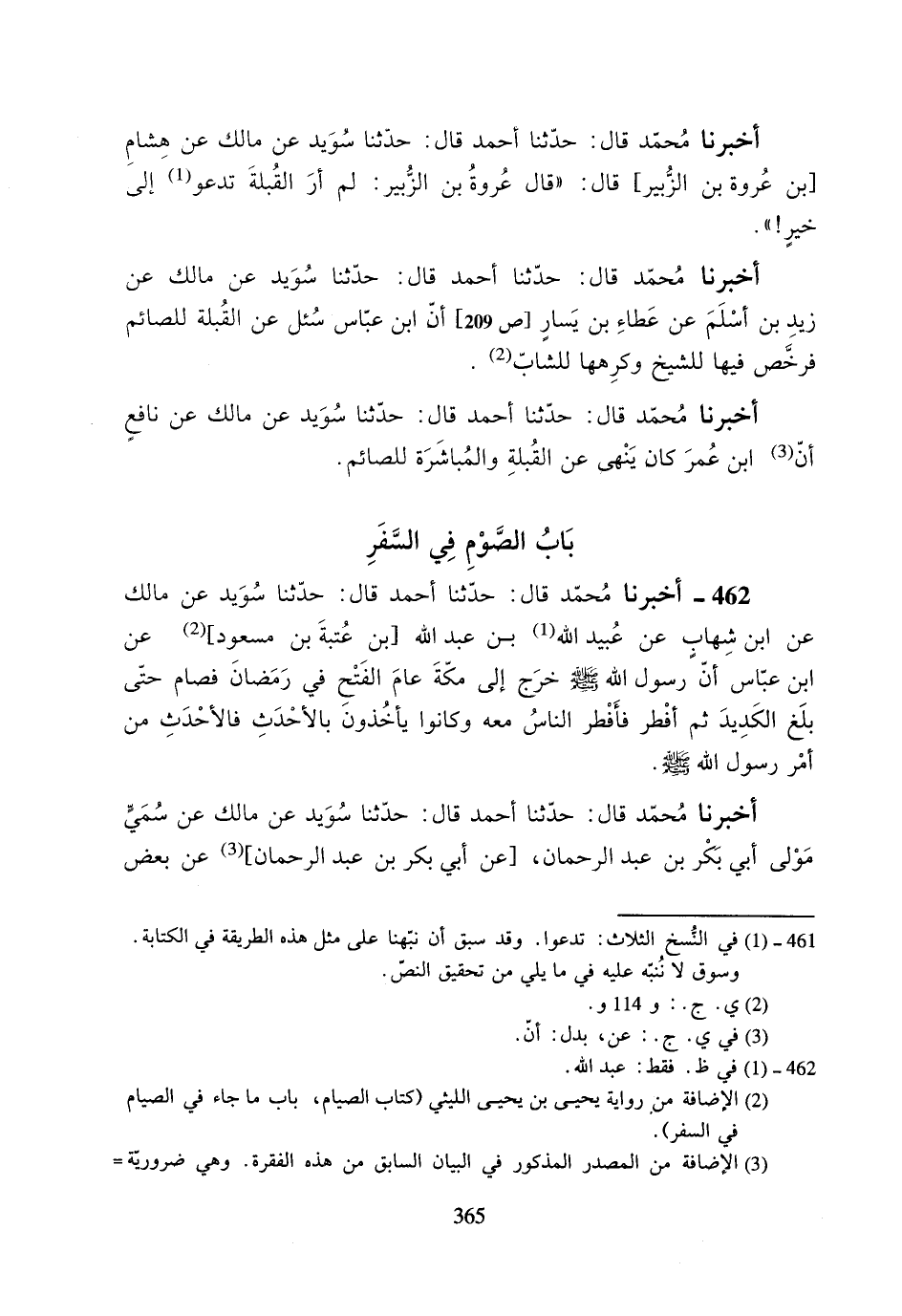 462- أخبرنا محمد قال: حدثنا أحمد قال: حدثنا سويد عن مالك عن ابن شهابٍ عن عبيد الله بن عبد الله [بن عتبة بن مسعود] عن ابن عباس أن رسول الله صلى الله عليه وسلم خرج إلى مكة عام الفتح في رمضان فصام حتى بلغ الكديد ثم أفطر فأفطر الناس معه وكانوا يأخذون بالأحدث فالأحدث من أمر رسول الله صلى الله عليه وسلم.