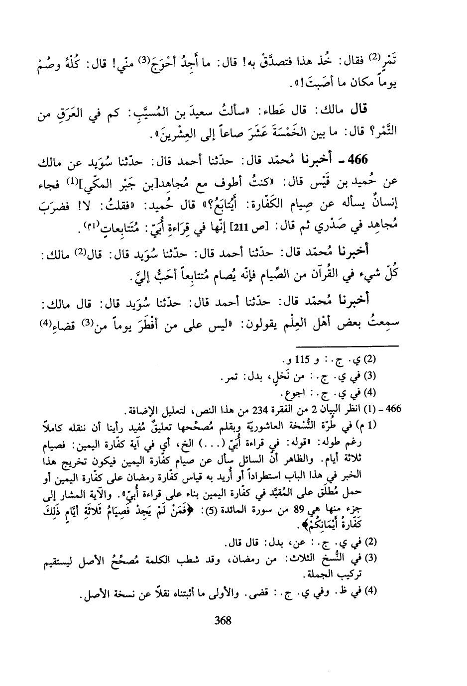 466- أخبرنا محمد قال: حدثنا أحمد قال: حدثنا سويد عن مالك عن حميد بن قيس قال: ((كنت أطوف مع مجاهد [بن جبر المكي] فجاء إنسانٌ يسأله عن صيام الكفارة: أيتابع؟)) قال حميد: ((فقلت: لا! فضرب مجاهد في صدري ثم قال: إنها في قراءة أبي: متتابعاتٍ.