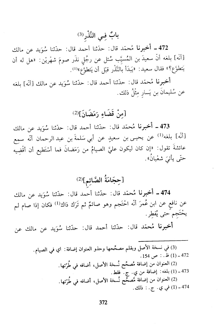 472- أخبرنا محمد قال: حدثنا أحمد قال: حدثنا سويد عن مالك [أنه] بلغه أن سعيد بن المسيب سئل عن رجلٍ نذر صوم شهرين: ((هل له أن يتطوع؟)) فقال سعيد: ((يبدأ بالنذر قبل أن يتطوع)).