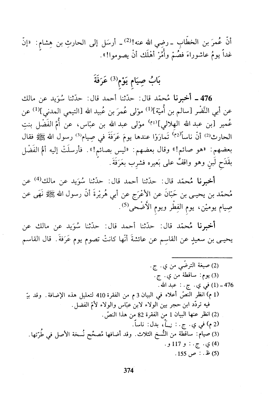 476- أخبرنا محمد قال: حدثنا أحمد قال: حدثنا سويد عن مالك عن أبي النضر [سالم بن أمية] مولى عمر بن عبيد الله [التيمي المدني] عن عمير [بن عبد الله الهلالي] مولى عبد الله بن عباس، عن أم الفضل بنت الحارث أن ناساً تماروا عندها يوم عرفة في صيام رسول الله صلى الله عليه وسلم فقال بعضهم: ((هو صائم!)) وقال بعضهم: ((ليس بصائمٍ!)). فأرسلت إليه أم الفضل بقدح لبنٍ وهو واقفٌ على بعيره فشرب بعرفة.