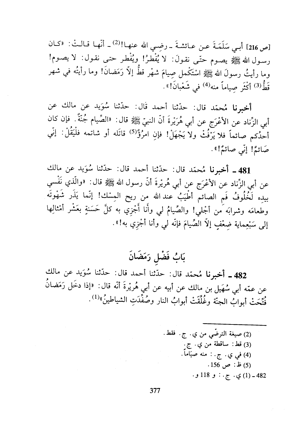 482- أخبرنا محمد قال: أخبرنا أحمد قال: حدثنا سويد عن مالك عن عمه أبي سهيل بن مالك عن أبيه عن أبي هريرة أنه قال: ((إذا دخل رمضان فتحت أبواب الجنة وغلقت أبواب النار وصفدت الشياطين)).