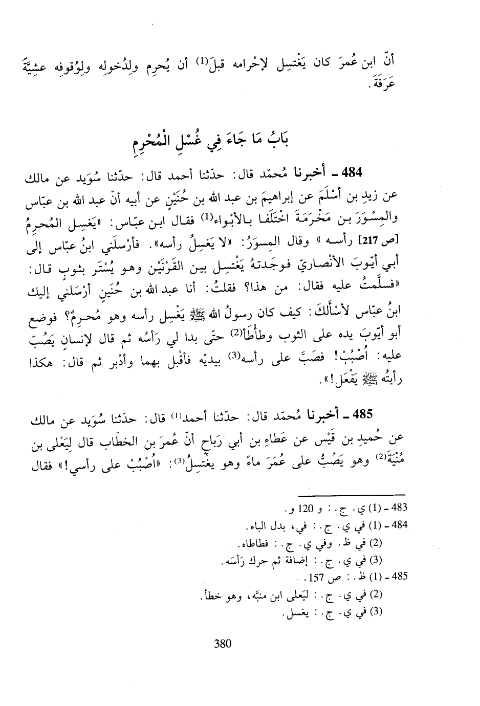 484- أخبرنا محمد قال: حدثنا أحمد قال: حدثنا سويد عن مالك عن زيد بن أسلم عن إبراهيم بن عبد الله بن حنين عن أبيه أن عبد الله بن عباس والمسور بن مخرمة اختلفا بالأبواء فقال ابن عباس: ((يغسل المحرم رأسه)) وقال المسور: ((لا يغسل رأسه)). فأرسلني ابن عباس إلى أبي أيوب الأنصاري فوجدته يغتسل بين القرنين وهو يستر بثوبٍ قال: ((فسلمت عليه فقال: من هذا؟ فقلت: أنا عبد الله بن حنين أرسلني إليك ابن عباس لأسألك: كيف كان رسول الله صلى الله عليه وسلم يغسل رأسه وهو محرمٌ؟ فوضع أبو أيوب يده على الثوب وطأطأ حتى بدا لي رأسه ثم قال لإنسانٍ يصب عليه: أصبب! فصب على رأسه بيديه فأقبل بهما وأدبر ثم قال: هكذا رأيته صلى الله عليه وسلم يفعل!)).