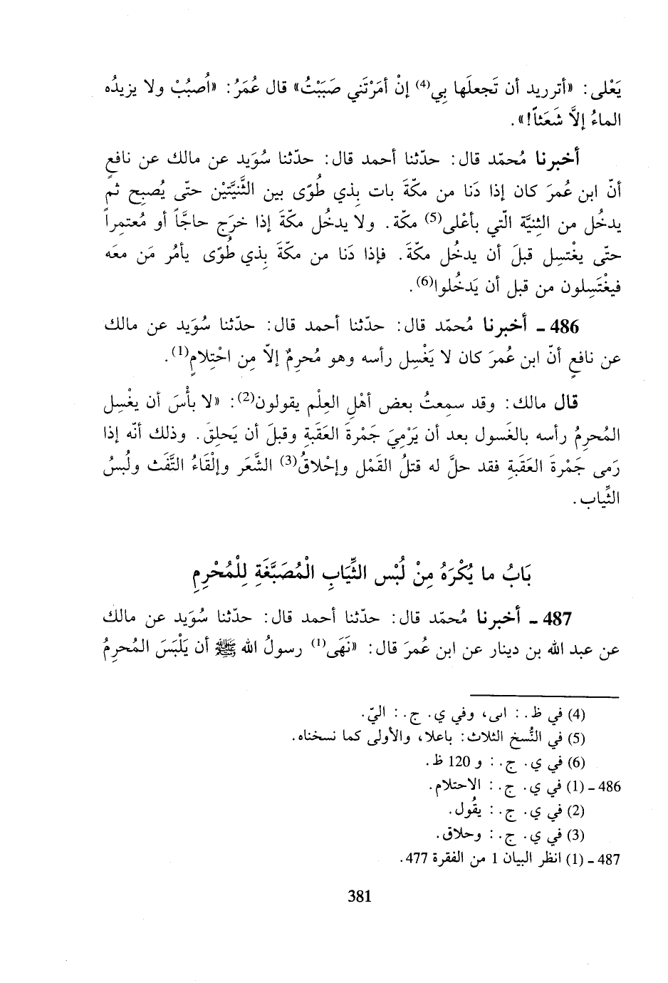 486- أخبرنا محمد قال: حدثنا أحمد قال: حدثنا سويد عن مالك عن نافعٍ أن ابن عمر كان لا يغسل رأسه وهو محرمٌ إلا من احتلامٍ.