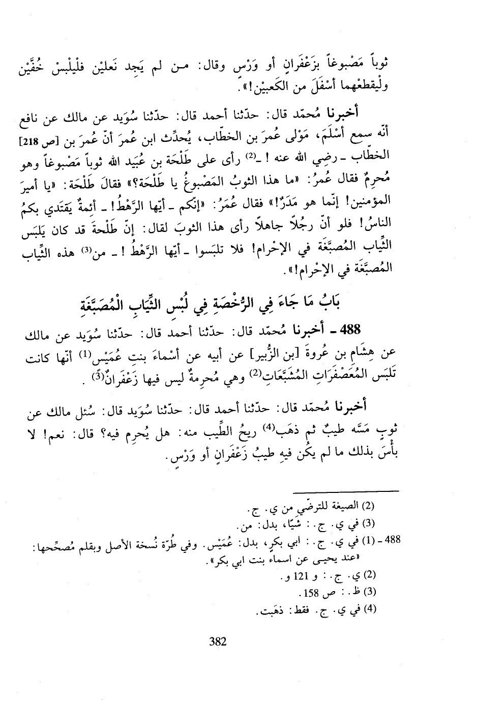 488- أخبرنا محمد قال: حدثنا أحمد قال: حدثنا سويد عن مالك عن هشام بن عروة [بن الزبير] عن أبيه عن أسماء بنت عميس أنها كانت تلبس المعصفرات المشبعات وهي محرمةٌ ليس فيها زعفرانٌ.