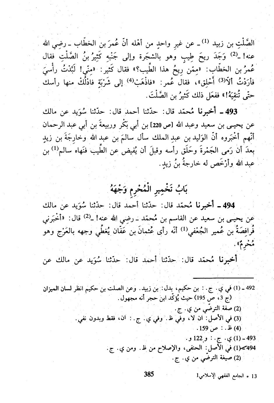 494- أخبرنا محمد قال: حدثنا أحمد قال: حدثنا سويد عن مالك عن يحيى بن سعيد عن القاسم بن محمد -رضي الله عنه!- قال: ((أخبرني فرافصة بن عمير الجعفي أنه رأى عثمان بن عفان يغطي وجهه بالعرج وهو محرمٌ)).