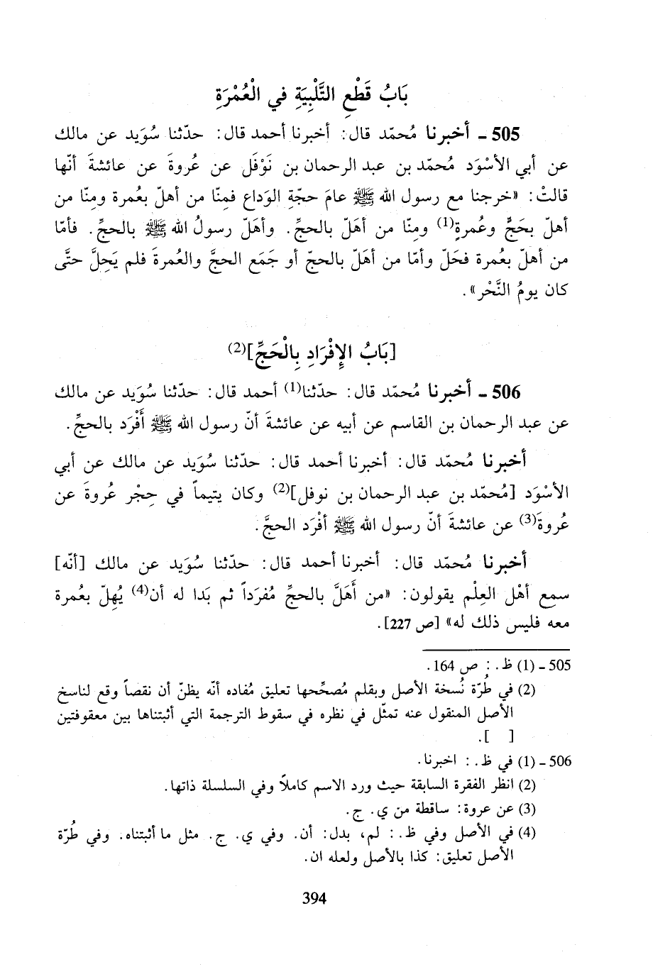 506- أخبرنا محمد قال: حدثنا أحمد قال: حدثنا سويد عن مالك عن عبد الرحمان بن القاسم عن أبيه عن عائشة أن رسول الله صلى الله عليه وسلم أفرد بالحج.