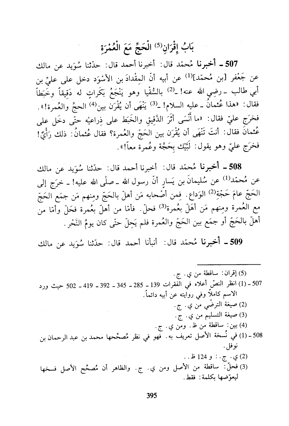 507- أخبرنا محمد قال: أخبرنا أحمد قال: حدثنا سويد عن مالك عن جعفر [بن محمد] عن أبيه أن المقداد بن الأسود دخل على علي بن أبي طالب -رضي الله عنه- بالسقيا وهو ينجع بكرات له دقيقاً وخبطاً فقال: ((هذا عثمان -عليه السلام!- ينهى أن يقرن بين الحج والعمرة!)). فخرج علي فقال: ((ما أنسى أثر الدقيق والخبط على ذراعيه حتى دخل على عثمان فقال: أنت تنهى أن يقرن بين الحج والعمرة؟ فقال عثمان: ذلك رأي! فخرج علي وهو يقول: لبيك بحجة وعمرة معاً!)).