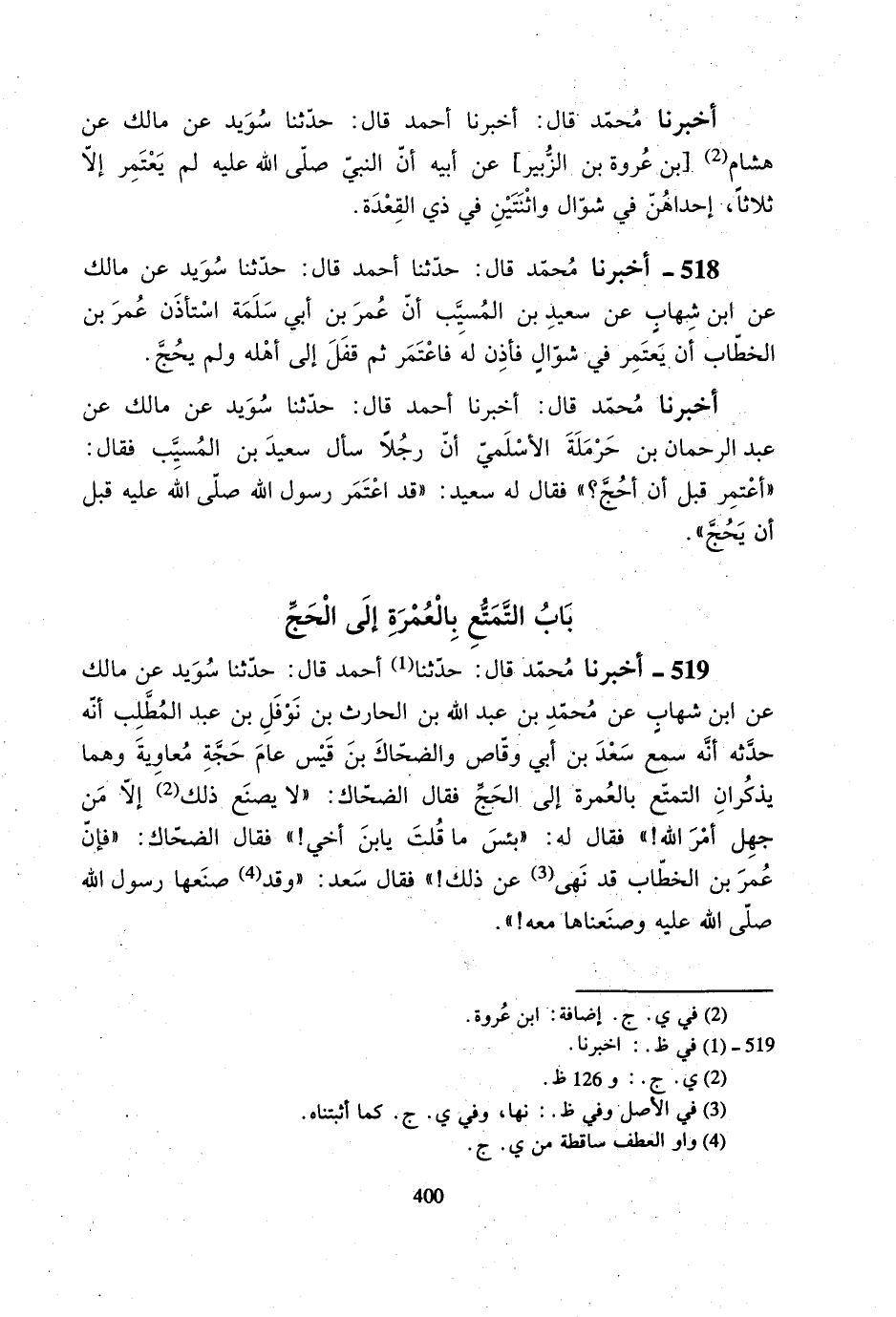 518- أخبرنا محمد قال: حدثنا أحمد قال: حدثنا سويد عن مالك عن ابن شهابٍ عن سعيد بن المسيب أن عمر بن أبي سلمة استأذن عمر بن الخطاب أن يعتمر في شوالٍ فأذن له فاعتمر ثم قفل إلى أهله ولم يحج.