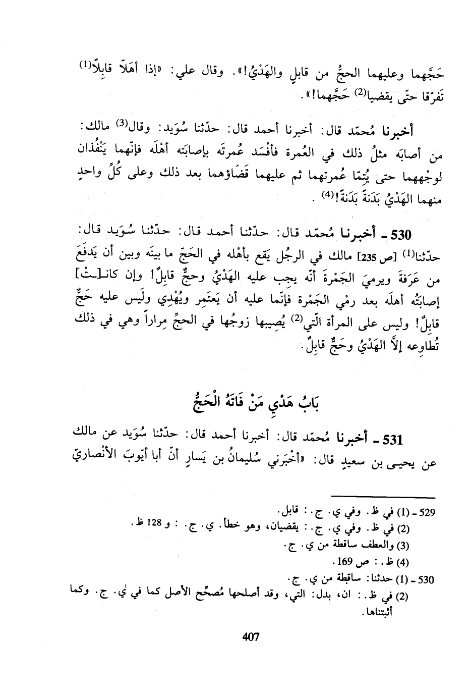 530- أخبرنا محمد قال: حدثنا أحمد قال: حدثنا سويد قال: حدثنا مالك في الرجل يقع بأهله في الحج ما بينه وبين أن يدفع من عرفة ويرمي الجمرة أنه يجب عليه الهدي وحج قابلٌ! وإن كانـ[ـت] إصابته أهله بعد رمي الجمرة فإنما عليه أن يعتمر ويهدي وليس عليه حج قابلٌ! وليس على المرأة التي يصيبها زوجها في الحج مراراً وهي في ذلك تطاوعه إلا الهدي وحج قابلٌ.
