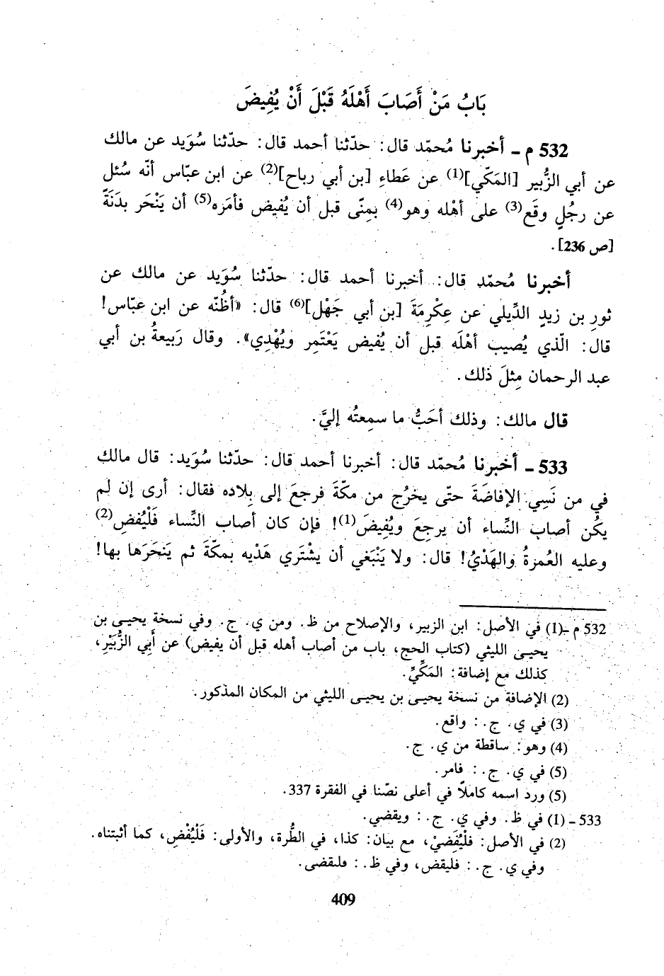 533- أخبرنا محمد قال: أخبرنا أحمد قال: حدثنا سويد: قال مالك في من نسي الإفاضة حتى يخرج من مكة فرجع إلى بلاده فقال: أرى إن لم يكن أصاب النساء أن يرجع ويفيض! فإن كان أصاب النساء فليفض وعليه العمرة والهدي! قال: ولا ينبغي أن يشتري هديه بمكة ثم ينحرها بها! #410# ولكنه إن لم يكن ساقه معه من حيث اعتمر فليشتريه بمكة ثم ليخرجه إلى الحل ويسوقه معه إلى مكة لينحره بها.
