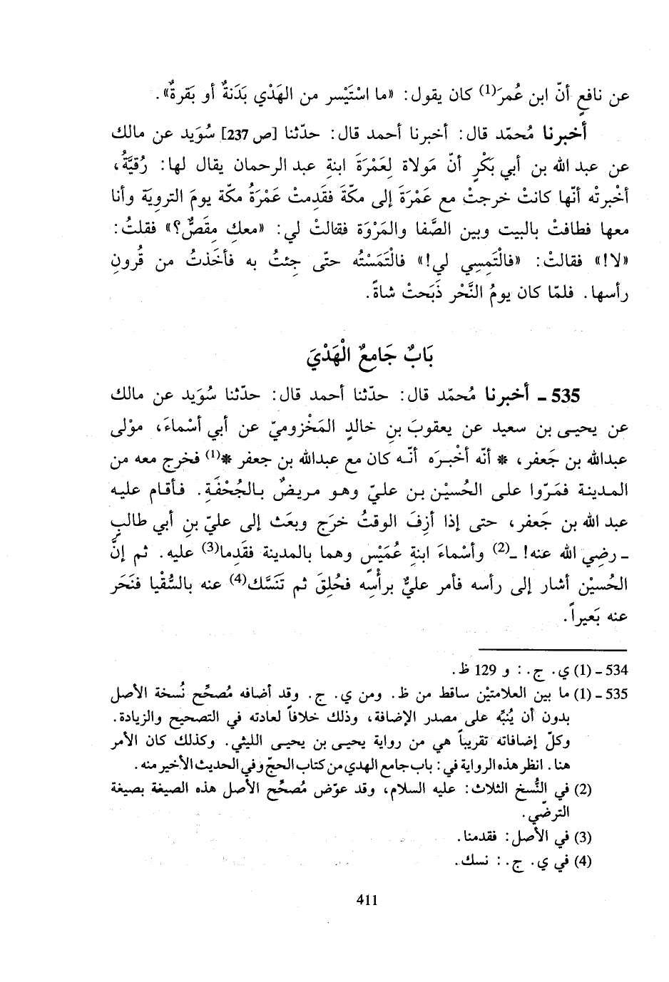 535- أخبرنا محمد قال: حدثنا أحمد قال: حدثنا سويد عن مالك عن يحيى بن سعيد عن يعقوب بن خالدٍ المخزومي عن أبي أسماء، مولى عبد الله بن جعفر، أنه أخبره أنه كان مع عبد الله بن جعفر فخرج معه من المدينة فمروا على الحسين بن علي وهو مريضٌ بالجحفة. فأقام عليه عبد الله بن جعفر، حتى إذا أزف الوقت خرج وبعث إلى علي بن أبي طالبٍ -رضي الله عنه!- وأسماء ابنة عميسٍ وهما بالمدينة فقدما عليه. ثم إن الحسين أشار إلى رأسه فأمر علي برأسه فحلق ثم تنسك عنه بالسقيا فنحر عنه بعيراً.