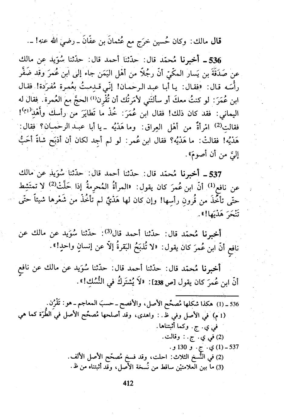 536- أخبرنا محمد قال: حدثنا أحمد قال: حدثنا سويد عن مالك عن صدقة بن يسار المكي أن رجلاً من أهل اليمن جاء إلى ابن عمر وقد ضفر رأسه قال: ((فقال: يا أبا عبد الرحمان! إني قدمت بعمرة مفردة! فقال ابن عمر: لو كنت معك أو سألتني لأمرتك أن تقرن الحج مع العمرة. فقال له اليماني: فقد كان ذلك! فقال ابن عمر: خذ ما تطاير من رأسك وأهد! فقالت امرأةٌ من أهل العراق: وما هديه - يا أبا عبد الرحمان؟ فقال: هديه! فقالت: ما هديه؟ فقال ابن عمر: لو لم أجد لكان أن أذبح شاةً أحب إلي من أن أصوم)).