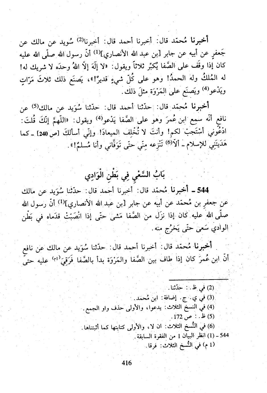 544- أخبرنا محمد قال: أخبرنا أحمد قال: حدثنا سويد عن مالك عن جعفر بن محمد عن أبيه عن جابر [بن عبد الله الأنصاري] أن رسول الله صلى الله عليه كان إذا نزل من الصفا مشى حتى إذا انصبت قدماه في بطن الوادي سعى حتى يخرج منه.