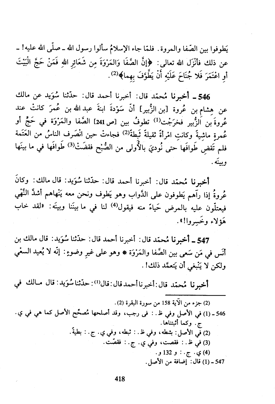 547- أخبرنا محمد قال: أخبرنا أحمد قال: حدثنا سويد قال مالك بن أنس في من سعى بين الصفا والمروة وهو على غير وضوءٍ: إنه لا يعيد السعي ولكن لا ينبغي أن يتعمد ذلك!.