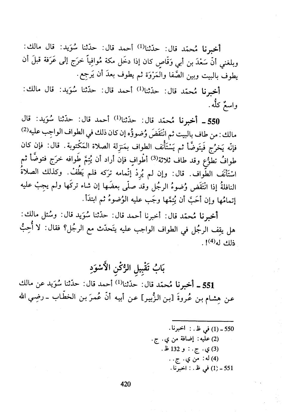 550- أخبرنا محمد قال: حدثنا أحمد قال: حدثنا سويد: قال مالك: من طاف بالبيت ثم انتقض وضوؤه إن كان ذلك في الطواف الواجب عليه فإنه يخرج فيتوضأ ثم يستأنف الطواف بمنزلة الصلاة المكتوبة. قال: فإن كان طواف تطوع وقد طاف ثلاثة أطوافٍ فإن أراد أن يتم طوافه خرج فتوضأ ثم استأنف الطواف. قال: وإن لم يرد إتمامه تركه فلم يطف. وكذلك الصلاة النافلة إذا انتقض وضوء الرجل وقد صلى بعضها إن شاء تركها ولم يجب عليه إتمامها وإن أحب أن يتمها وجب عليه الوضوء ثم ابتدأ.