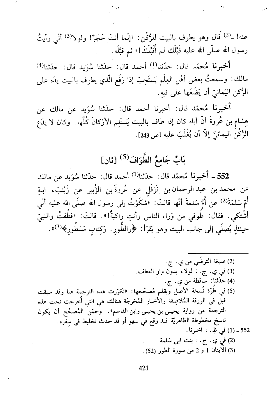 552- أخبرنا محمد قال: حدثنا أحمد قال: حدثنا سويد عن مالك عن محمد بن عبد الرحمان بن نوفل عن عروة بن الزبير عن زينب، ابنة أم سلمة عن أم سلمة أنها قالت: ((شكوت إلى رسول الله صلى الله عليه أني أشتكي. فقال: طوفي من وراء الناس وأنت راكبةٌ!)). قالت: ((فطفت والنبي حينئذٍ يصلي إلى جانب البيت وهو يقرأ: {والطور. وكتابٍ مسطورٍ})).