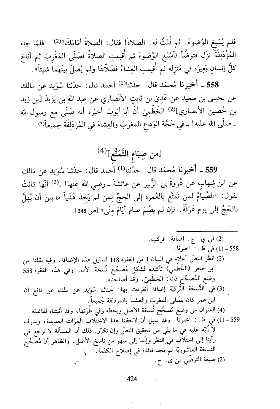 559- أخبرنا محمد قال: حدثنا أحمد قال: حدثنا سويد عن مالك عن ابن شهابٍ عن عروة بن الزبير عن عائشة -رضي الله عنها!- أنها كانت تقول: ((الصيام لمن تمتع بالعمرة إلى الحج لمن لم يجد هدياً ما بين أن يهل بالحج إلى يوم عرفة. فإن لم يصم صام أيام منىً)).