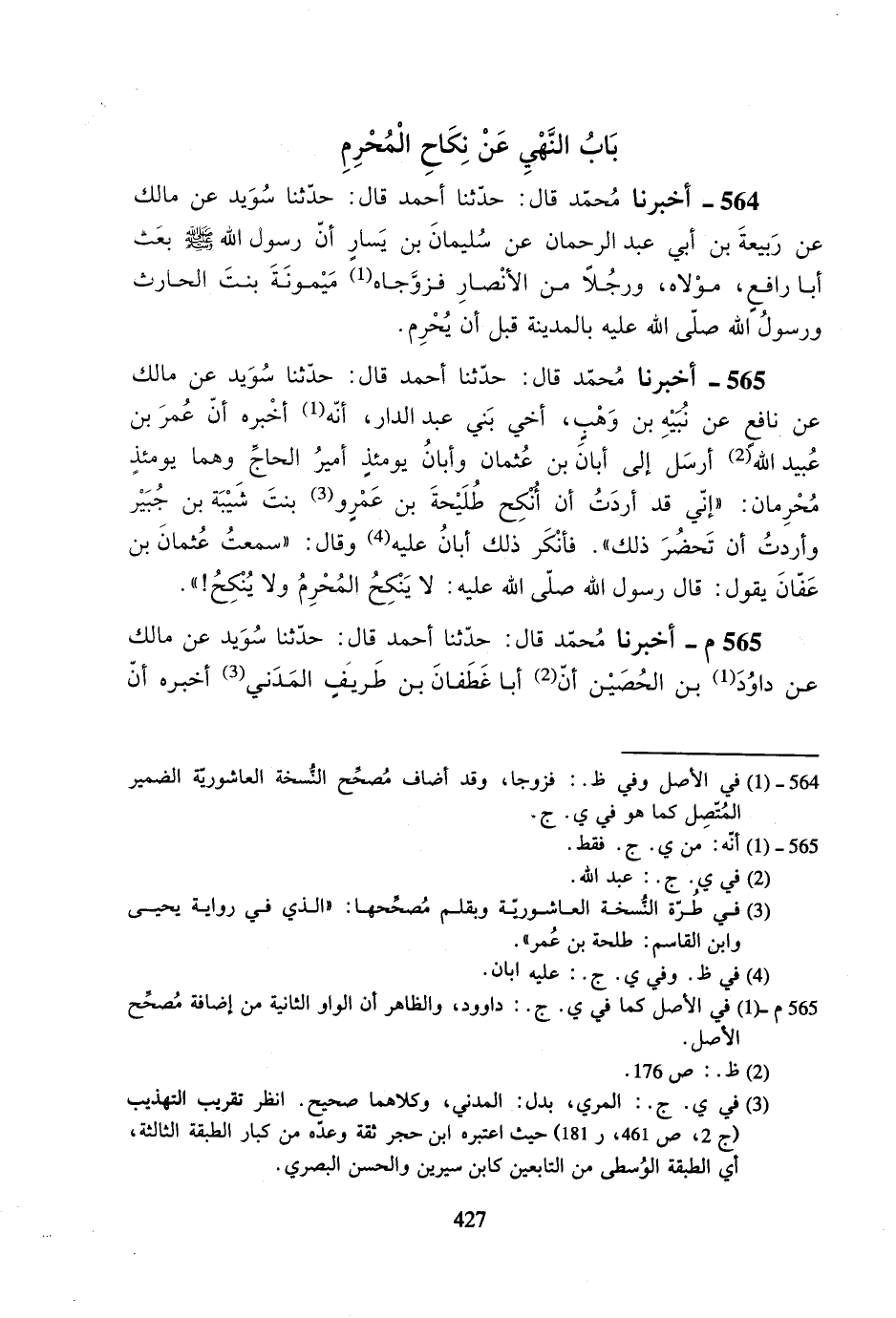 565م- أخبرنا محمد قال: حدثنا أحمد قال: حدثنا سويد عن مالك عن داود بن الحصين أن أبا غطفان بن طريفٍ المدني أخبره أن #428# أبا طريف تزوج امرأةً وهو محرمٌ فرد عمر بن الخطاب -رضي الله عنه!- نكاحه.