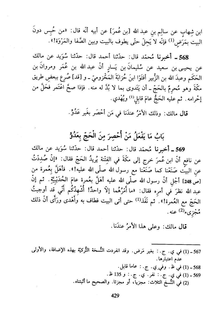568- أخبرنا محمد قال: حدثنا أحمد قال: حدثنا سويد عن مالك عن يحيى بن سعيد عن سليمان بن يسارٍ أن عبد الله بن عمر ومروان بن الحكم وعبد الله بن الزبير أفتوا ابن حزابة المخزومي -و[قد] صرع ببعض طريق مكة وهو محرمٌ بالحج- أن يتدوى بما لا بد له منه. فإذا صح اعتمر فحل من إحرامه. ثم عليه الحج عام قابلٍ ويهدي.