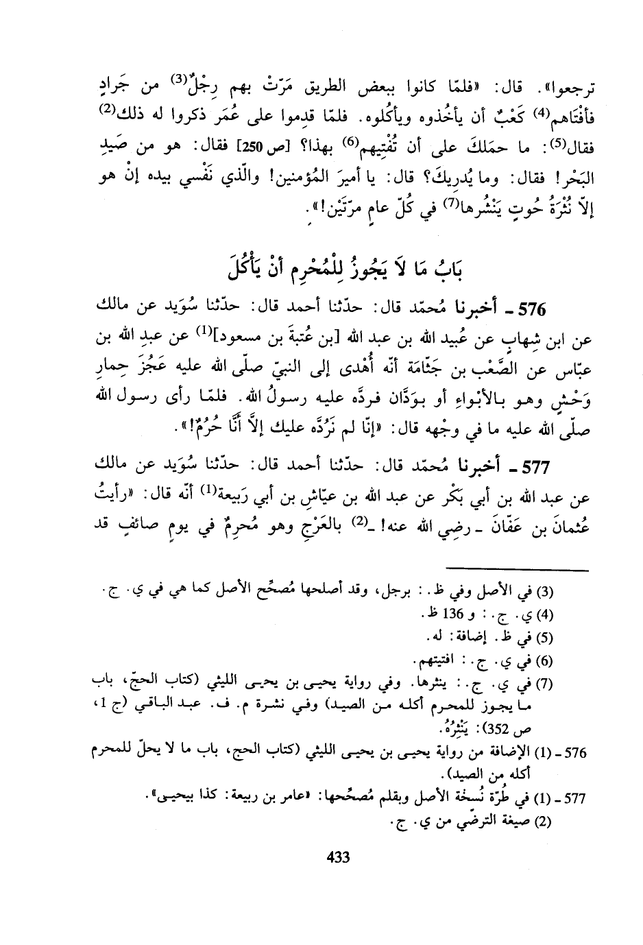 576- أخبرنا محمد قال: حدثنا أحمد قال: حدثنا سويد عن مالك عن ابن شهابٍ عن عبيد الله بن عبد الله [بن عتبة بن مسعود] عن عبد الله بن عباس عن الصعب بن جثامة أنه أهدى إلى النبي صلى الله عليه عجز حمار وحشٍ وهو بالأبواء أو بودان فرده عليه رسول الله. فلما رأى رسول الله صلى الله عليه ما في وجهه قال: ((إنا لم نرده عليك إلا أنا حرمٌ!)).