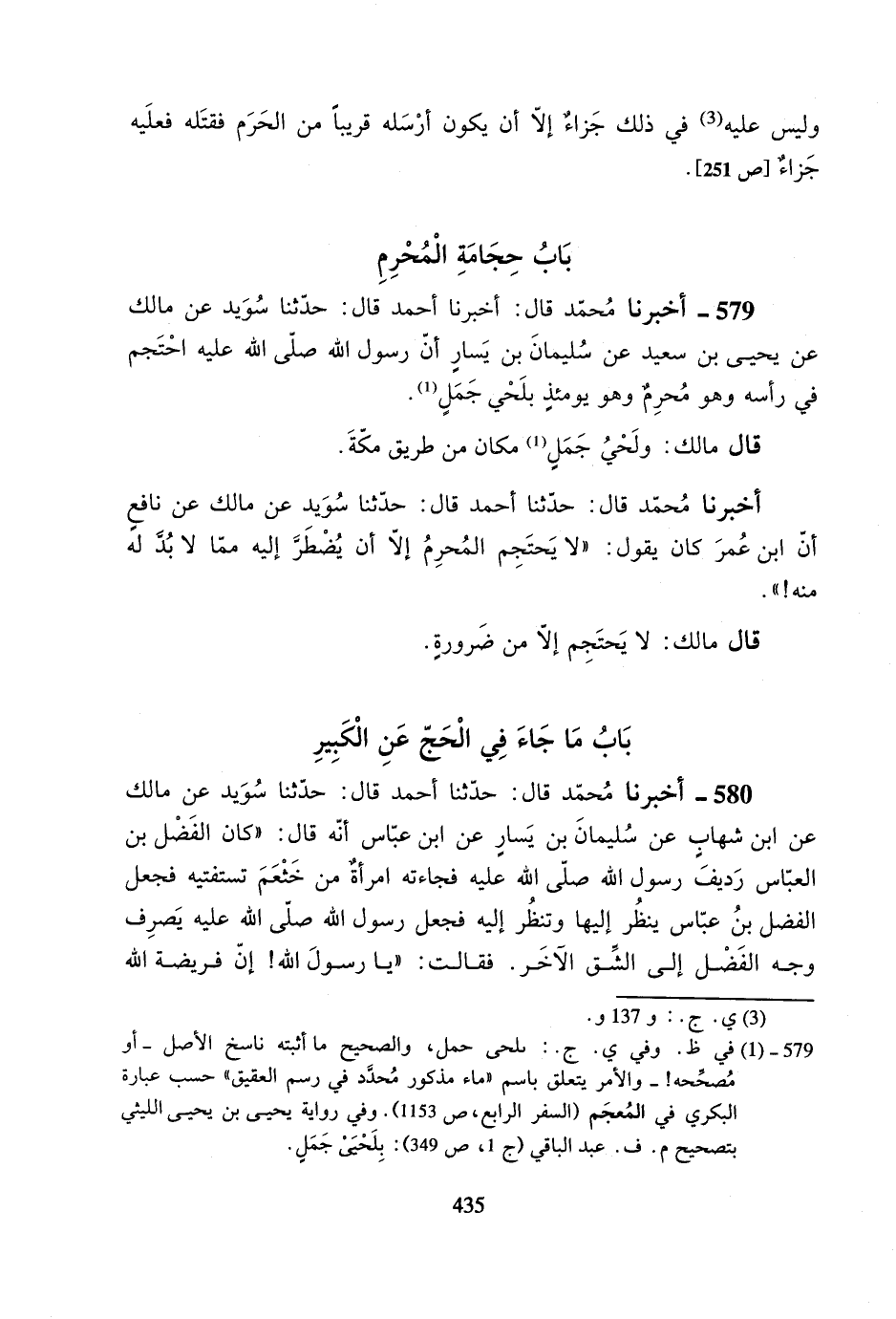 579- أخبرنا محمد قال: أخبرنا أحمد قال: حدثنا سويد عن مالك عن يحيى بن سعيد عن سليمان بن يسارٍ أن رسول الله صلى الله عليه احتجم في رأسه وهو محرمٌ وهو يومئذٍ بلحي جملٍ.