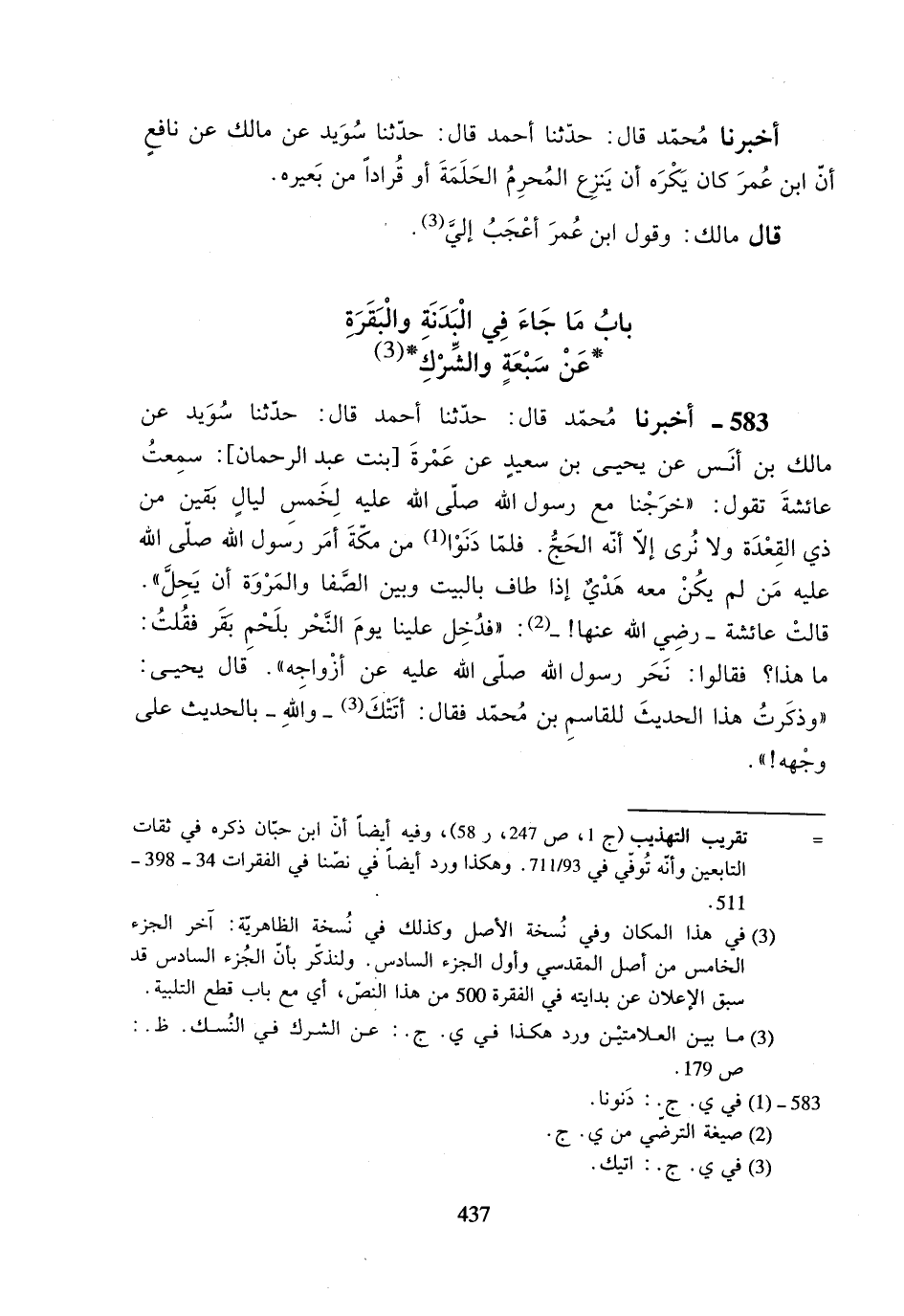 583- أخبرنا محمد قال: حدثنا أحمد قال: حدثنا سويد عن مالك بن أنس عن يحيى بن سعيدٍ عن عمرة [بنت عبد الرحمان]: سمعت عائشة تقول: ((خرجنا مع رسول الله صلى الله عليه لخمس ليالٍ بقين من ذي القعدة ولا نرى إلا أنه الحج. فلما دنوا من مكة أمر رسول الله صلى الله عليه من لم يكن معه هديٌ إذا طاف بالبيت وبين الصفا والمروة أن يحل)). قالت عائشة -رضي الله عنها!- ((فدخل علينا يوم النحر بلحم بقر فقلت: ما هذا؟ فقالوا: نحر رسول الله صلى الله عليه عن أزواجه)). قال يحيى: ((وذكرت هذا الحديث للقاسم بن محمد فقال: أتتك -والله- بالحديث على وجهه!)).