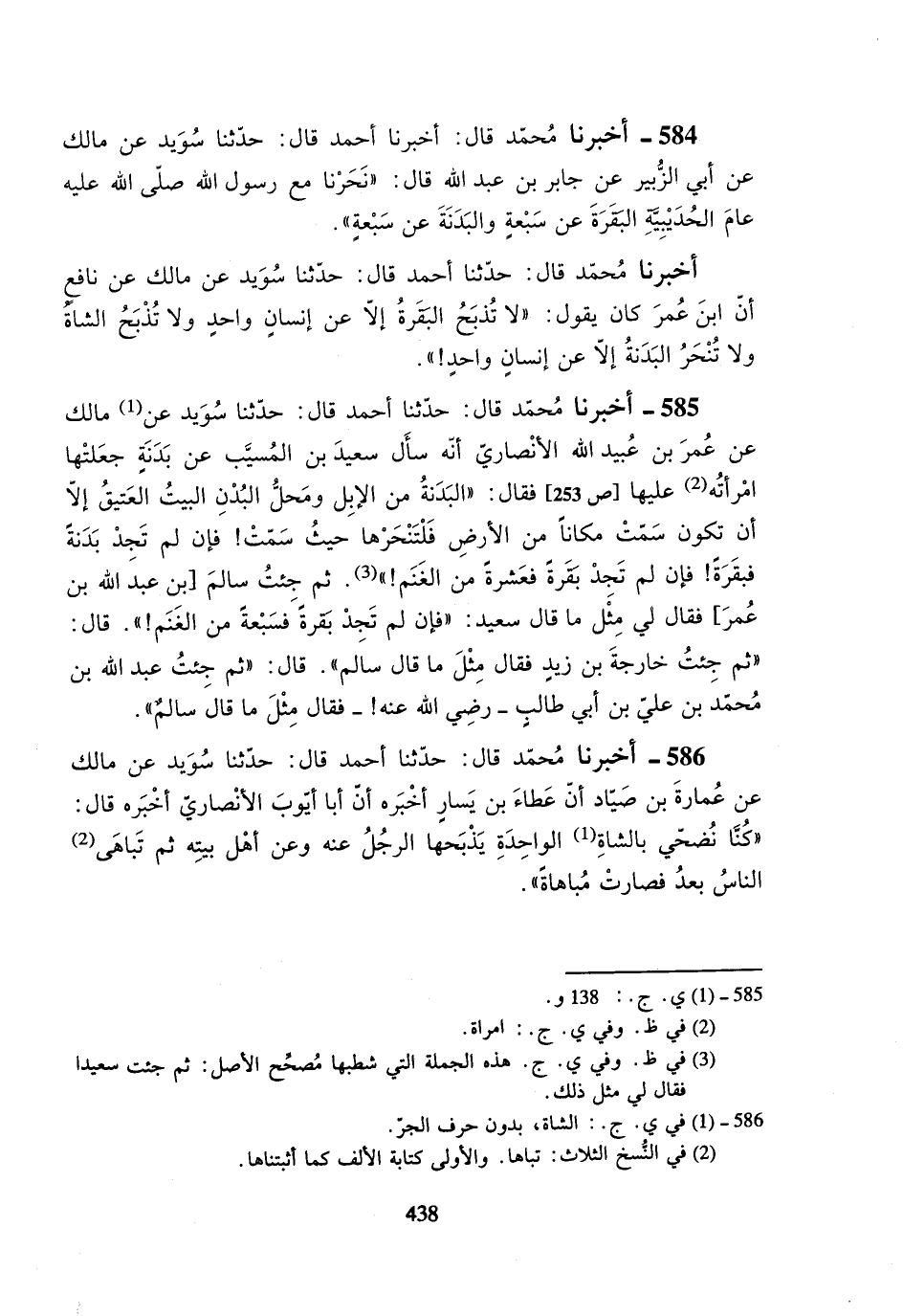585- أخبرنا محمد قال: حدثنا أحمد قال: حدثنا سويد عن مالك عن عمر بن عبيد الله الأنصاري أنه سأل سعيد بن المسيب عن بدنةٍ جعلتها امرأته عليها فقال: ((البدنة من الإبل ومحل البدن البيت العتيق إلا أن تكون سمت مكاناً من الأرض فلتنحرها حيث سمت! فإن لم تجد بدنةً فبقرةً! فإن لم تجد بقرةً فعشرةً من الغنم)). ثم جئت سالم [بن عبد الله بن عمر] فقال لي مثل ما قال سعيد: ((فإن لم تجد بقرةً فسبعةً من الغنم)). قال: ((ثم جئت خارجة بن زيدٍ فقال مثل ما قال سالم)). قال: ((ثم جئت عبد الله بن محمد بن علي بن أبي طالبٍ -رضي الله عنه!- فقال مثل ما قال سالمٌ)).