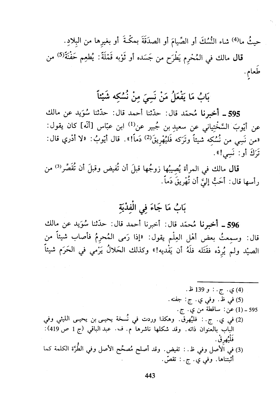 595- أخبرنا محمد قال: حدثنا أحمد قال: حدثنا سويد عن مالك عن أيوب السختياني عن سعيد بن جبير عن ابن عباس [أنه] كان يقول ((من نسي من نسكه شيئاً وتركه فليهريق دماً!)). قال أيوب: ((لا أدري قال: ترك أو: نسي!)).