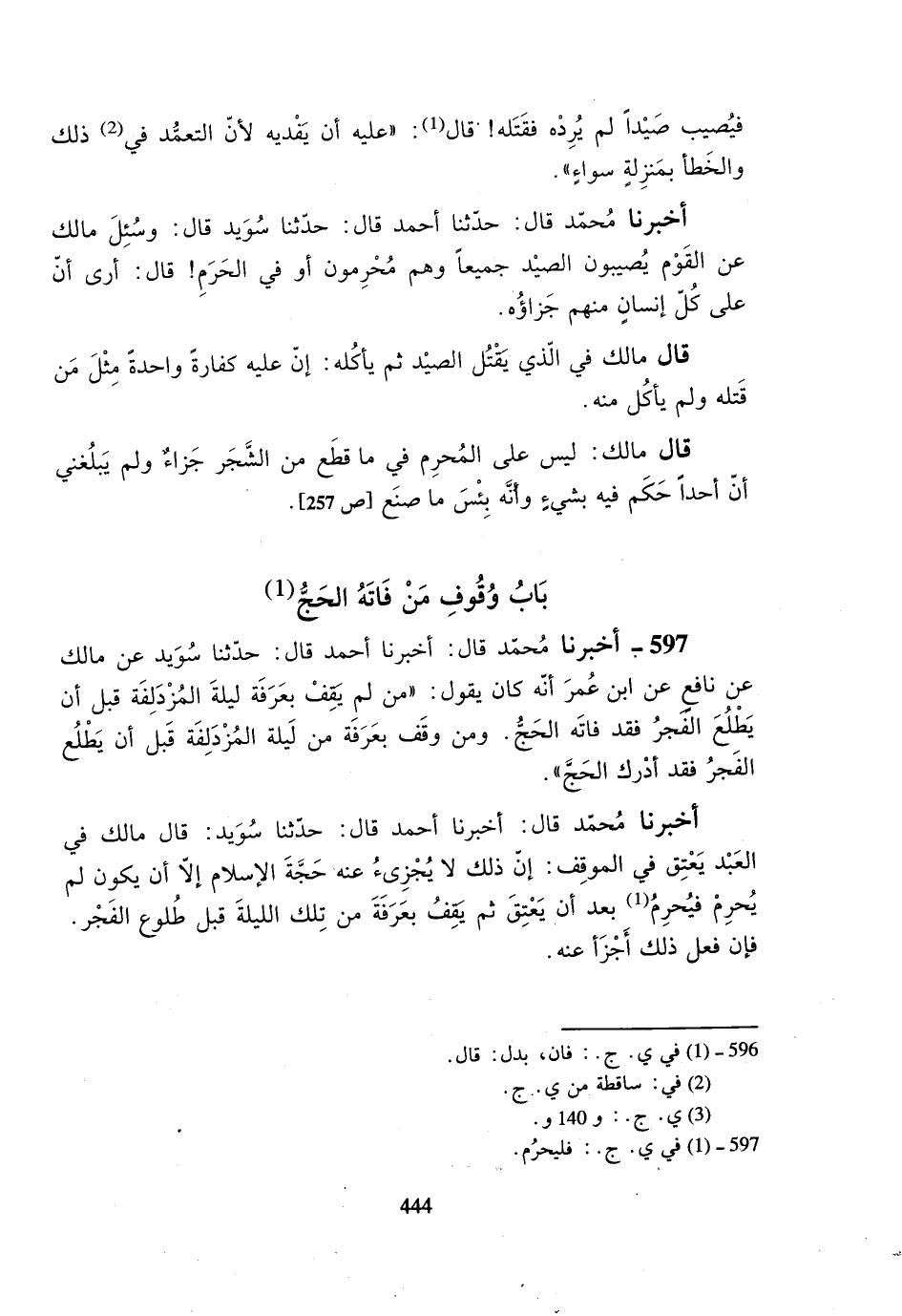 597- أخبرنا محمد قال: حدثنا أحمد قال: حدثنا سويد عن مالك عن نافعٍ عن ابن عمر أنه كان يقول: ((من لم يقف بعرفة ليلة المزدلفة قبل أن يطلع الفجر فقد فاته الحج. ومن وقف بعرفة من ليلة المزدلفة قبل أن يطلع الفجر فقد أدرك الحج)).