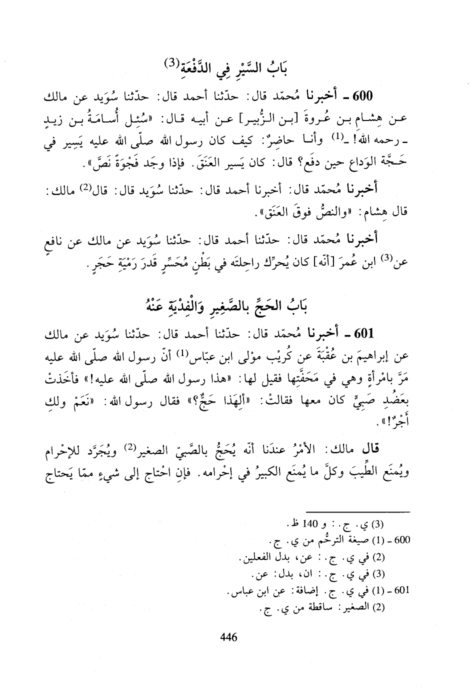 600- أخبرنا محمد قال: حدثنا أحمد قال: حدثنا سويد عن مالك عن هشام بن عروة [بن الزبير] عن أبيه قال: ((سئل أسامة بن زيدٍ -رحمه الله!- وأنا حاضرٌ: كيف كان رسول الله صلى الله عليه يسير في حجة الوداع حين دفع؟ قال: كان يسير العنق. فإذا وجد فجوةً نص)).