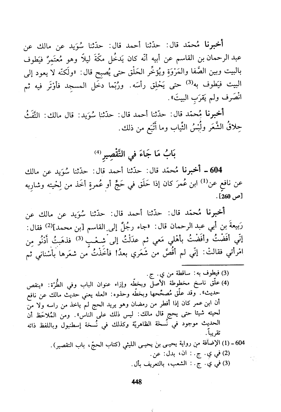 604- أخبرنا محمد قال: حدثنا أحمد قال: حدثنا سويد عن مالك عن نافعٍ عن ابن عمر كان إذا حلق في حج أو عمرةٍ أخذ من لحيته وشاربه.
