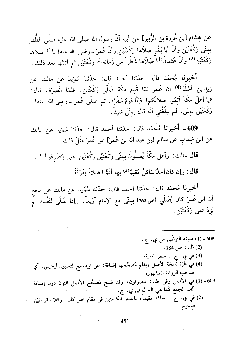 أخبرنا محمد قال: حدثنا أحمد قال: حدثنا سويد عن مالك عن نافعٍ أن ابن عمر كان يصلي بمنىً مع الإمام أربعاً. وإذا صلى لنفسه لم يزد على ركعتين.
