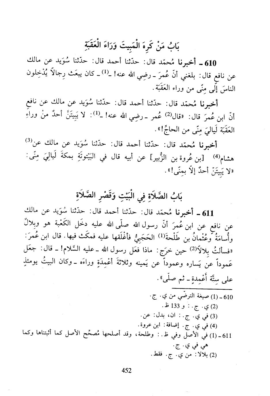 610- أخبرنا محمد قال: حدثنا أحمد قال: حدثنا سويد عن مالك عن نافعٍ قال: بلغني أن عمر -رضي الله عنه!- كان يبعث رجالاً يدخلون الناس إلى منى من وراء العقبة.