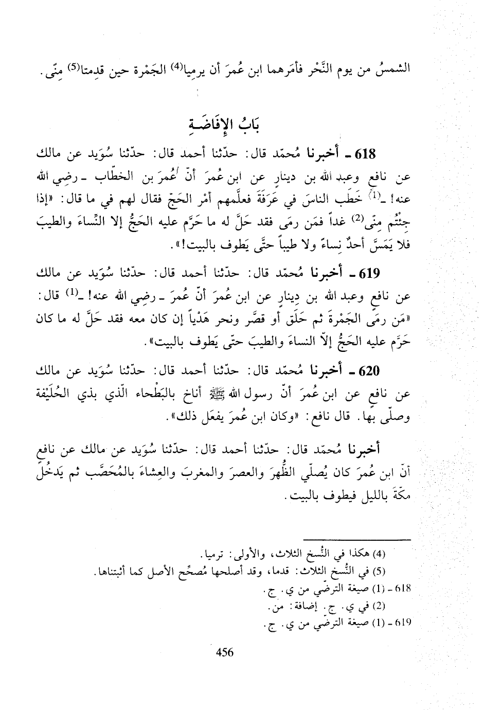 618- أخبرنا محمد قال: حدثنا أحمد قال: حدثنا سويد عن مالك عن نافع وعبد الله بن دينار عن ابن عمر أن عمر بن الخطاب -رضي الله عنه!- خطب الناس في عرفة فعلمهم أمر الحج فقال لهم في ما قال: ((إذا جئتم منى غداً فمن رمى فقد حل له ما حرم عليه الحج إلا النساء والطيب فلا يمس أحدٌ نساءً ولا طيباً حتى يطوف بالبيت!)).