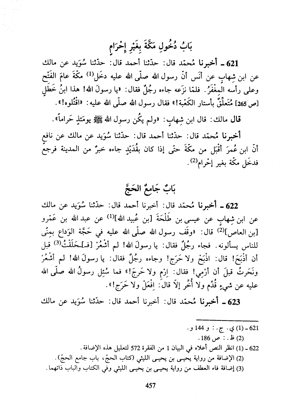 621- أخبرنا محمد قال: حدثنا أحمد قال: حدثنا سويد عن مالك عن ابن شهابٍ عن أنس أن رسول الله صلى الله عليه دخل مكة عام الفتح وعلى رأسه المغفر. فلما نزعه جاءه رجلٌ فقال: ((يا رسول الله! هذا ابن خطلٍ متعلقٌ بأستار الكعبة!)) فقال رسول الله صلى الله عليه: ((اقتلوه!)).