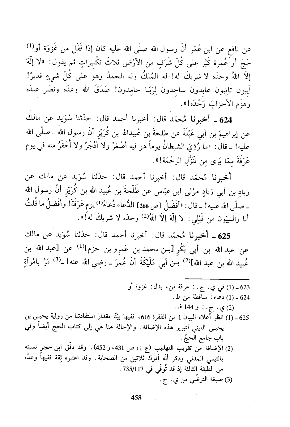 أخبرنا محمد قال: أخبرنا أحمد قال: حدثنا سويد عن مالك عن زياد بن أبي زياد مولى ابن عباس عن طلحة بن عبيد الله بن كريزٍ أن رسول الله -صلى الله عليه!- قال: ((أفضل الدعاء دعاء يوم عرفة! وأفضل ما قلت أنا والنبيون من قبلي: لا إله إلا الله وحده لا شريك له!)).