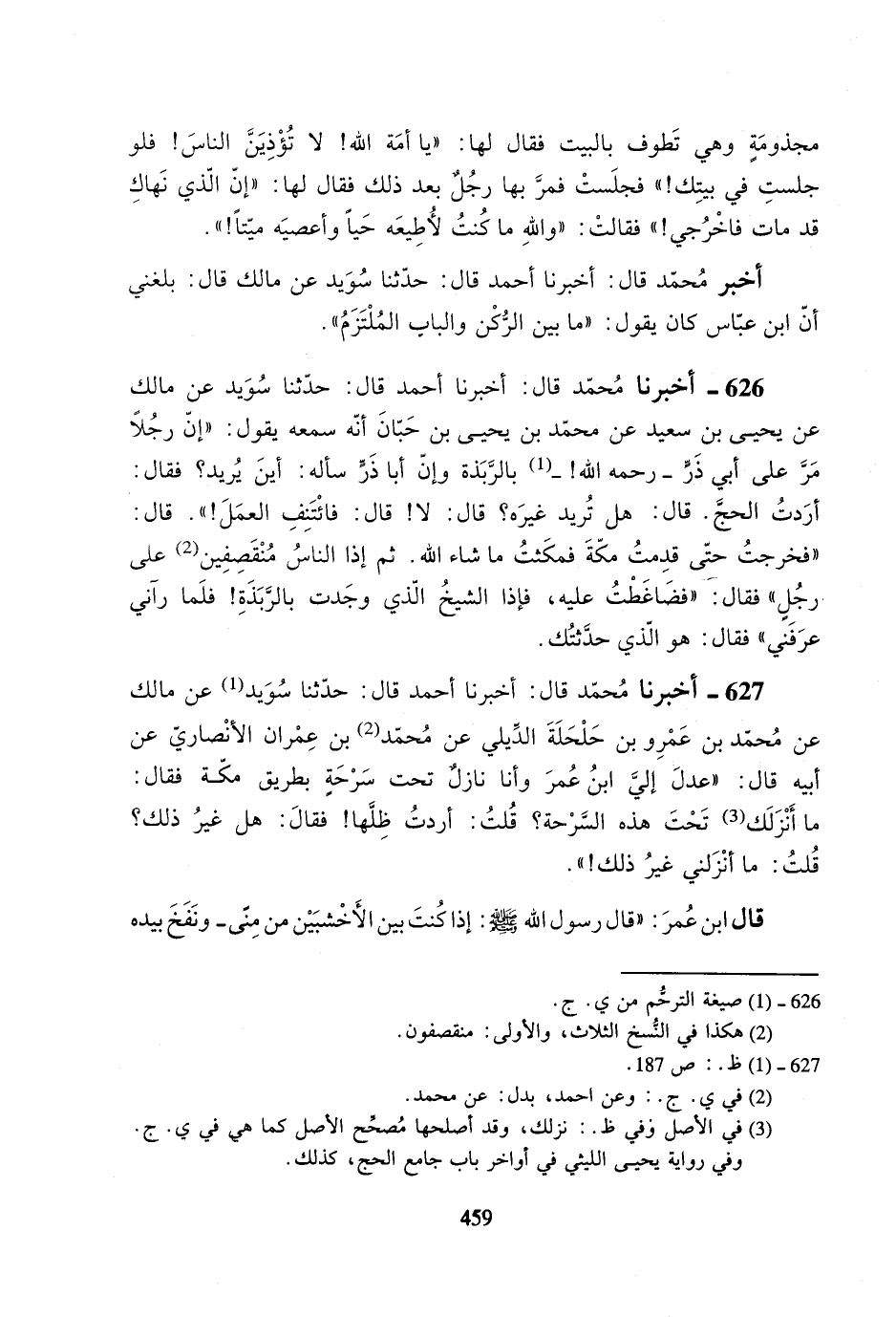 626- أخبرنا محمد قال: أخبرنا أحمد قال: حدثنا سويد عن مالك عن يحيى بن سعيد عن محمد بن يحيى بن حبان أنه سمعه يقول: ((إن رجلاً مر على أبي ذر -رحمه الله!- بالربذة وإن أبا ذر سأله: أين يريد؟ فقال: أردت الحج. قال: هل تريد غيره؟ قال: لا! قال: فائتنف العمل!)). قال: ((فخرجت حتى قدمت مكة فمكثت ما شاء الله. ثم إذا الناس منقصفين على رجلٍ)) فقال: ((فضاغطت عليه. فإذا الشيخ الذي وجدت بالربذة! فلما رآني عرفني)) فقال: هو الذي حدثتك.