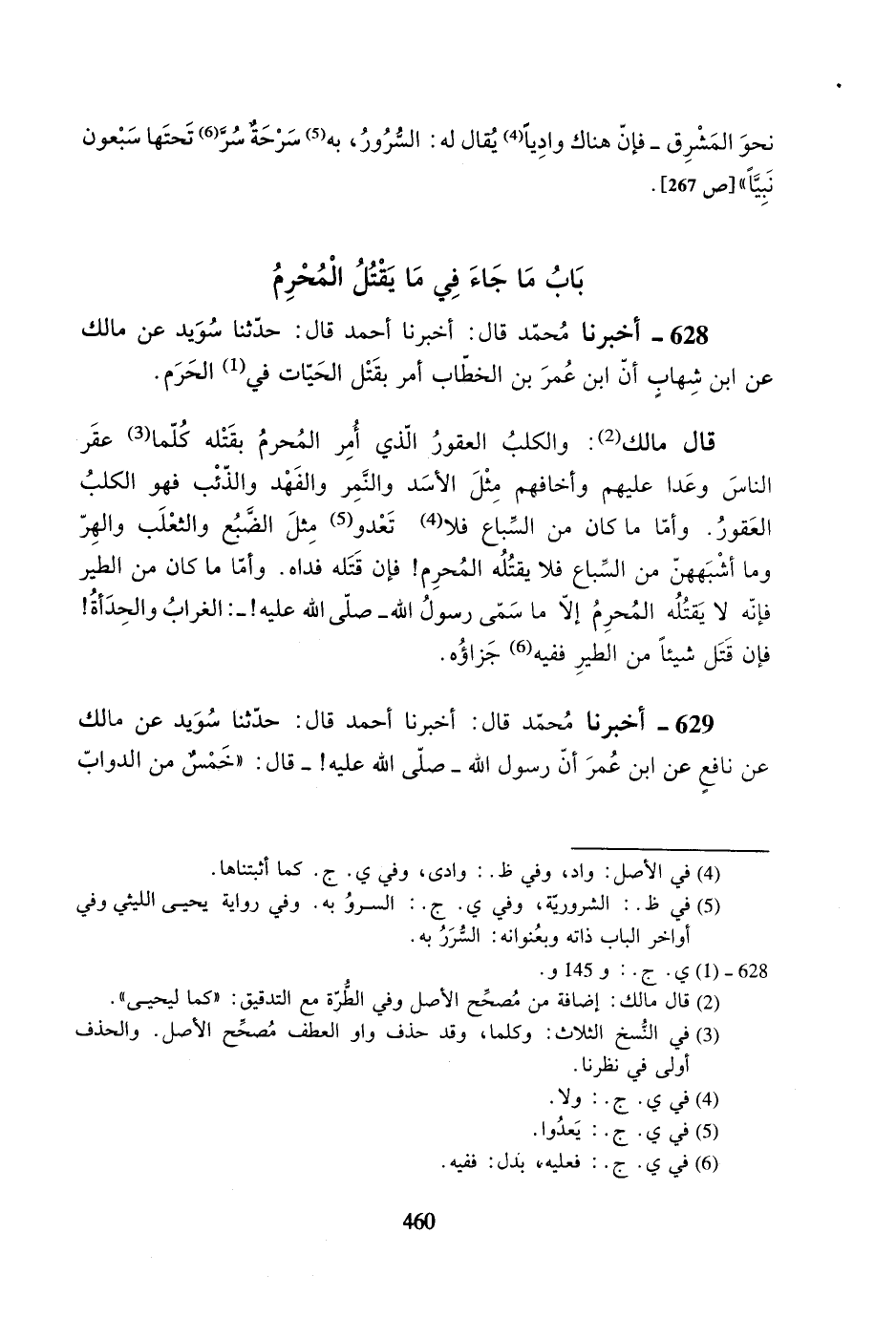 629- أخبرنا محمد قال: أخبرنا أحمد قال: حدثنا سويد عن مالك عن نافعٍ عن ابن عمر أن رسول الله -صلى الله عليه!- قال: ((خمسٌ من الدواب#461# ليس على المحرم في قتلهن جناحٌ: الغراب والحدأة والعقرب والفأرة والكلب العقور)).
