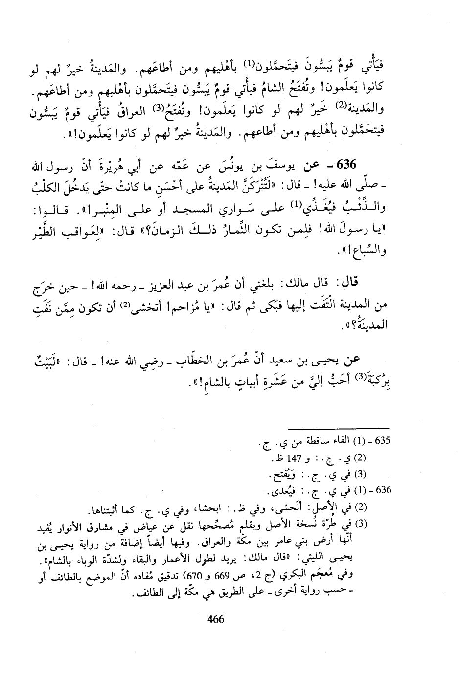 636- عن يوسف بن يونس عن عمه عن أبي هريرة أن رسول الله -صلى الله عليه!- قال: ((لتتركن المدينة على أحسن ما كانت حتى يدخل الكلب والذئب فيغذي على سواري المسجد أو على المنبر!)). قالوا: ((يا رسول الله! فلمن تكون الثمار ذلك الزمان؟)) قال: ((لعواقب الطير والسباع!)).
