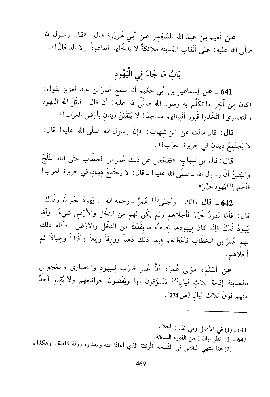 قال: قال ابن شهابٍ: ((ففحص عن ذلك عمر بن الخطاب حتى أتاه الثلج واليقين أن رسول الله -صلى الله عليه!- قال: لا يجتمع دينان في جزيرة العرب! فأجلى يهود خيبر)).