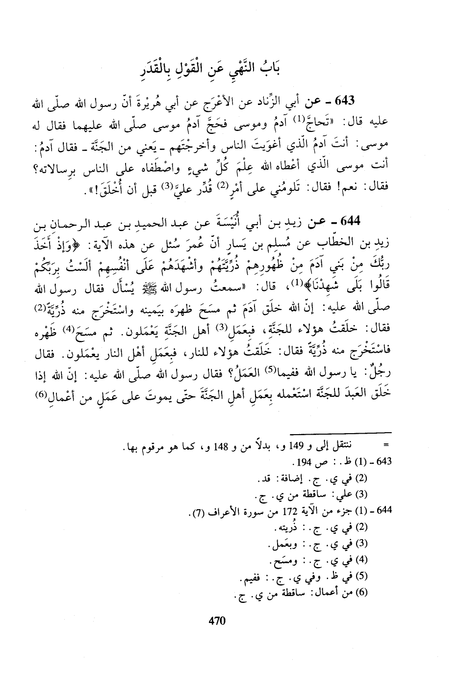 643- عن أبي الزناد عن الأعرج عن أبي هريرة أن رسول الله صلى الله عليه قال: ((تحاج آدم وموسى فحج آدم موسى صلى الله عليهما فقال له موسى: أنت آدم الذي أغويت الناس وأخرجتهم -يعني من الجنة- فقال آدم: أنت موسى الذي أعطاه الله علم كل شيءٍ واصطفاه على الناس برسالاته؟ فقال: نعم! فقال: تلومني على أمرٍ قدر علي قبل أن أخلق!)).