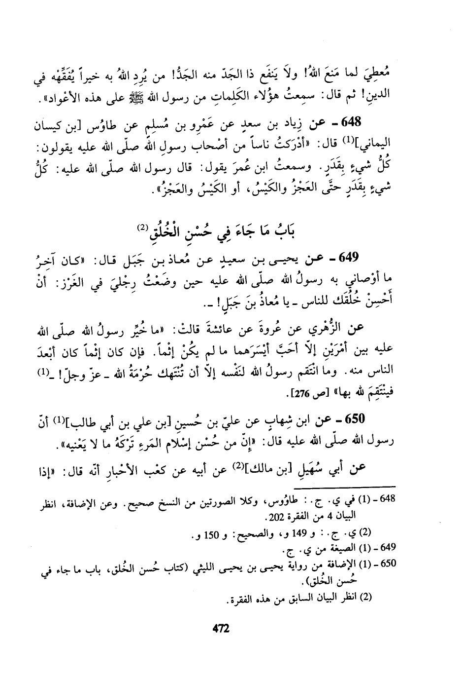 649- عن يحيى بن سعيدٍ عن معاذ بن جبل قال: ((كان آخر ما أوصاني به رسول الله صلى الله عليه حين وضعت رجلي في الغرز: أن أحسن خلقك للناس -يا معاذ بن جبلٍ!-.