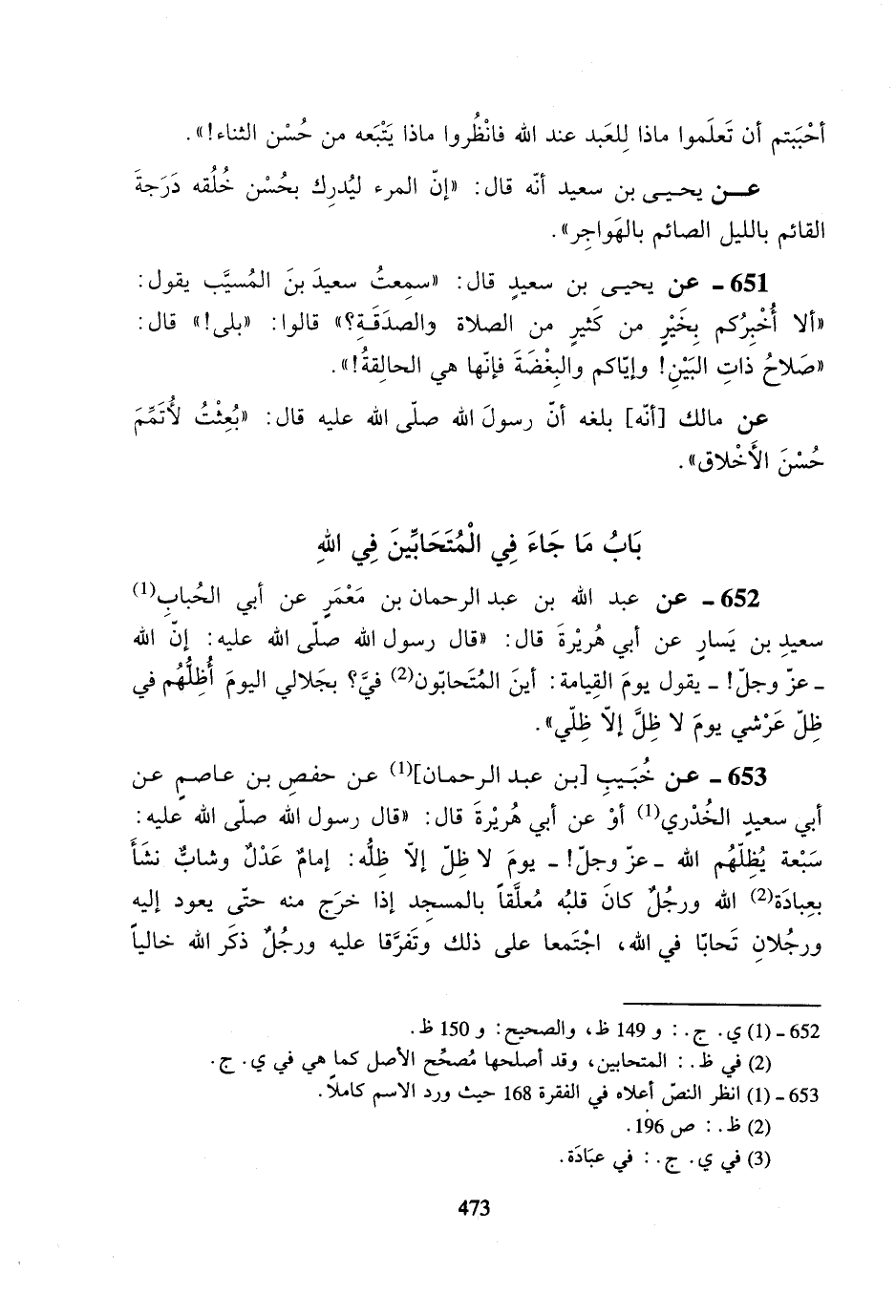 652- عن عبد الله بن عبد الرحمن بن معمرٍ عن أبي الحباب سعيد بن يسار عن أبي هريرة قال: ((قال رسول الله صلى الله عليه: إن الله -عز وجل!- يقول يوم القيامة: أين المتحابون في؟ بجلالي اليوم أظلهم في ظل عرشي يوم لا ظل إلا ظلي)).